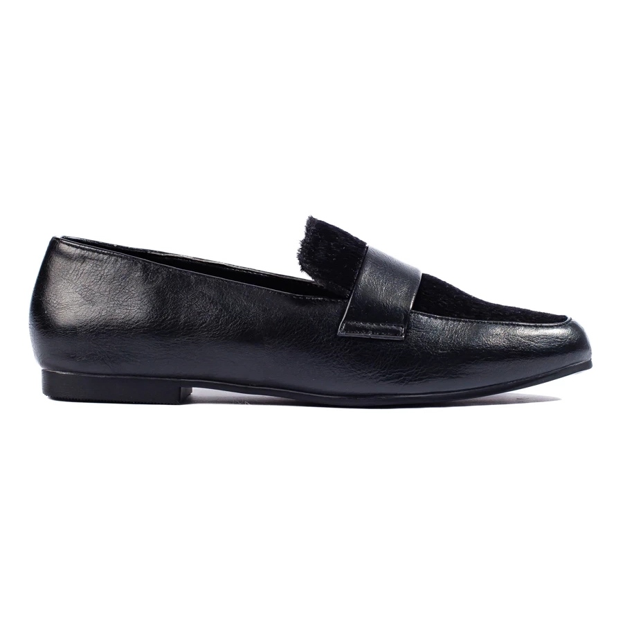 Elegantní a pohodlné černé mokamaty v černé barvě, zdobené měkkou kožešinou. Perfektní každý den a pro slavnostní příležitosti - kombinují neformální charakter s módním ženským přízvukem.