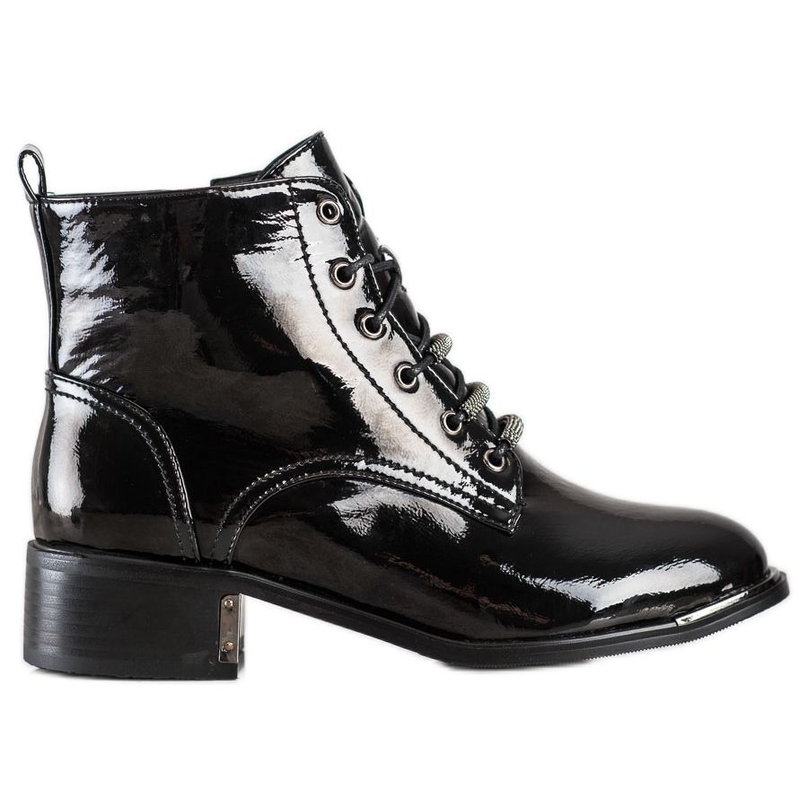 Kozačky se zapínají na zip, který usnadňuje nazouvání a vyzouvání a dodatečné šněrování umožňuje lepší přizpůsobení noze. Lakovaný povrch jim dodává jedinečný lesk, díky čemuž jsou dokonalým doplňkem jakéhokoli stylingu.