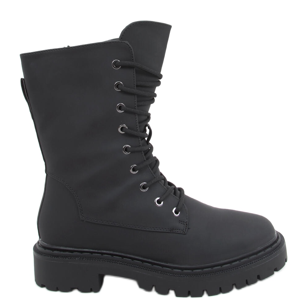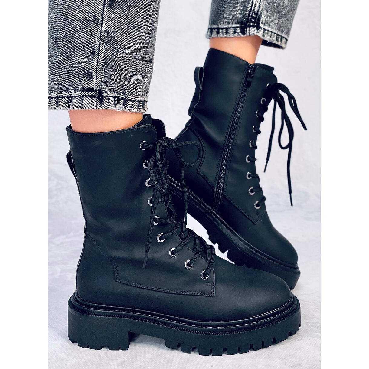 Klasické šněrování umožňuje individuální přizpůsobení šířce chodidla, zip na boční straně svršku zase usnadňuje nazouvání a vyzouvání. Tyto černé kozačky na 3,5 cm vysokém plochém podpatku jsou ideální pro každodenní styling a dodávají jim vojenský nádech. Díky zateplení v podobě jemného kožíšku budou perfektní volbou do chladnějších dnů.