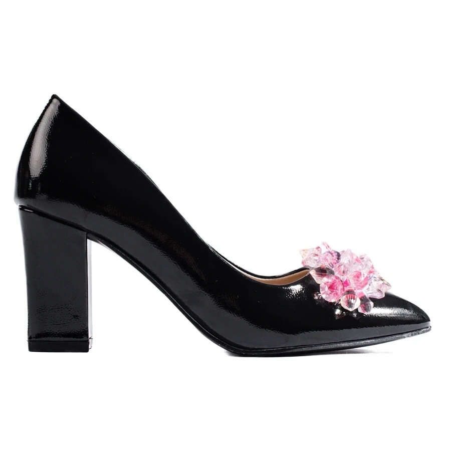 Klasická černá čerpadla na sloupku (8 cm pata) vyrobená z lakované ekologické kůže, zdobené kamínky. Model s kulatým nosem a vestavěným, ztuhlým upevňovacím prvkem, přírodní koženou vložkou, která zaručuje nošení pohodlí. Ideální pro oslavy, večerní výlety a elegantní příležitostné styly.