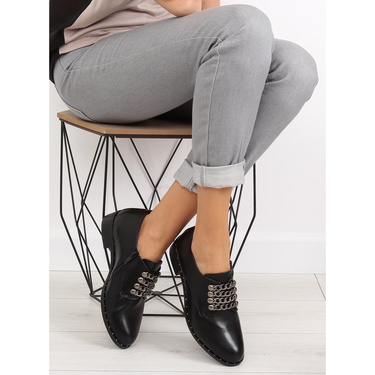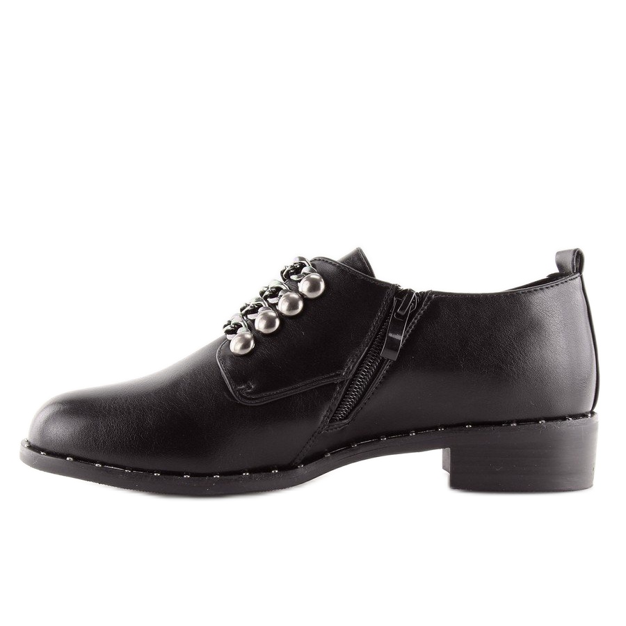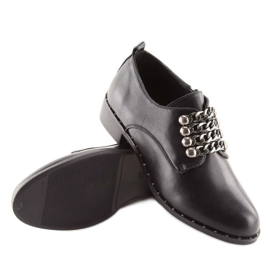 Dámské černé mokasíny C-7160 Black jsou vynikající volbou pro ženy, které chtějí spojit klasický styl s módním akcentem. Tyto boty se vyznačují elegantním, ale jedinečným stylem, který přitahuje pozornost. Ozdobné šněrování v podobě řetízku dodává originalitu a lem posetý drobnými cvočky dodává klasickému designu trochu šílenosti.