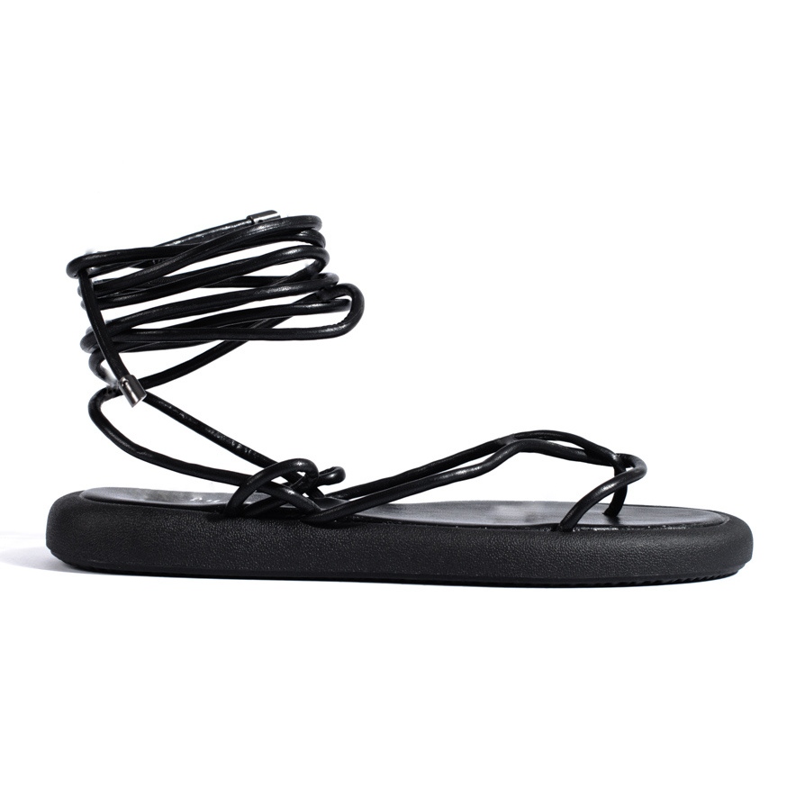 Design těchto sandálů zaujme minimalistickou, ale zároveň výraznou černou barvou svršku i podrážky. Klasické černé sandály na šněrování nesmí chybět v šatníku každé ženy, protože se skvěle hodí k většině letních outfitů, od volných šatů až po kraťasy a džíny.