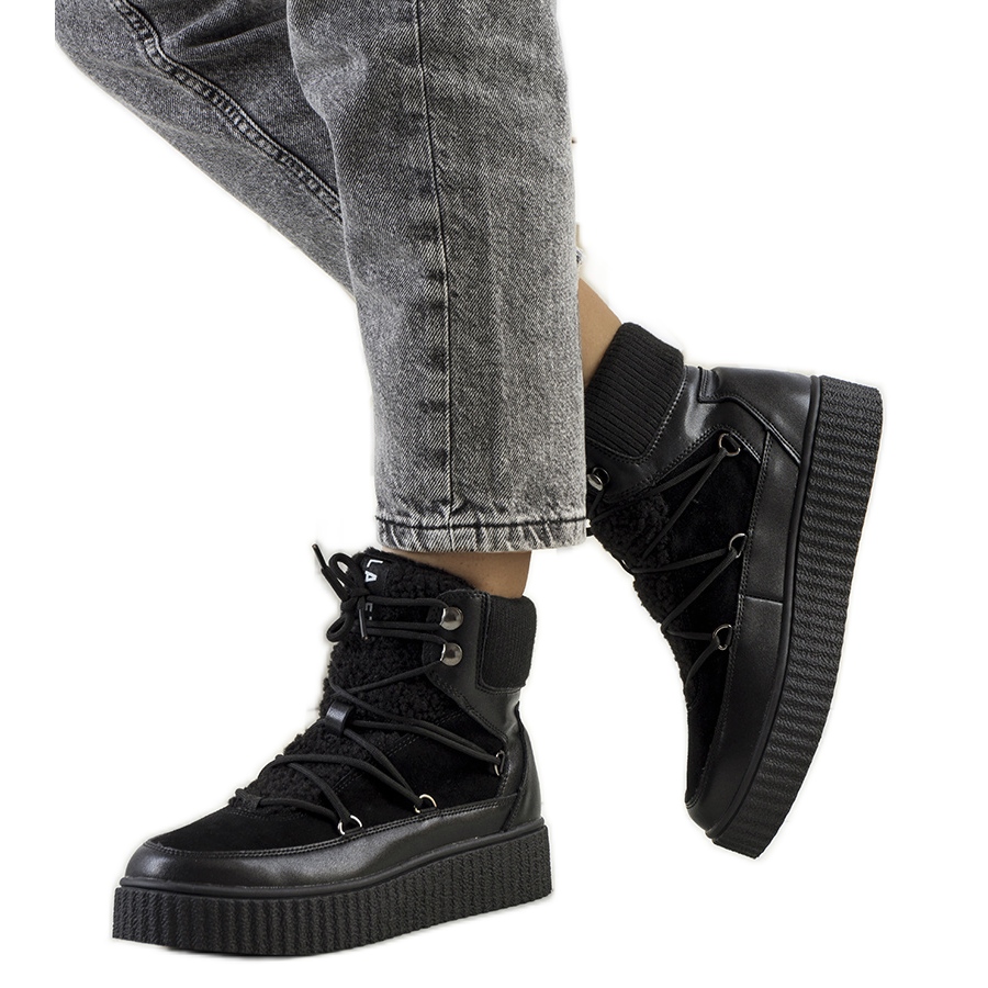 Vnitřek bot je zakončen hřejivým kožíškem, který účinně chrání před chladem a zároveň dodává útulný charakter. Zapínání na tkaničky umožňuje dokonalé přizpůsobení noze, což zaručuje pohodlí při každém kroku. Kulatá špička a 3,5 cm vysoká platforma zajišťují stabilitu a pohodlí a opticky prodlužují nohy.