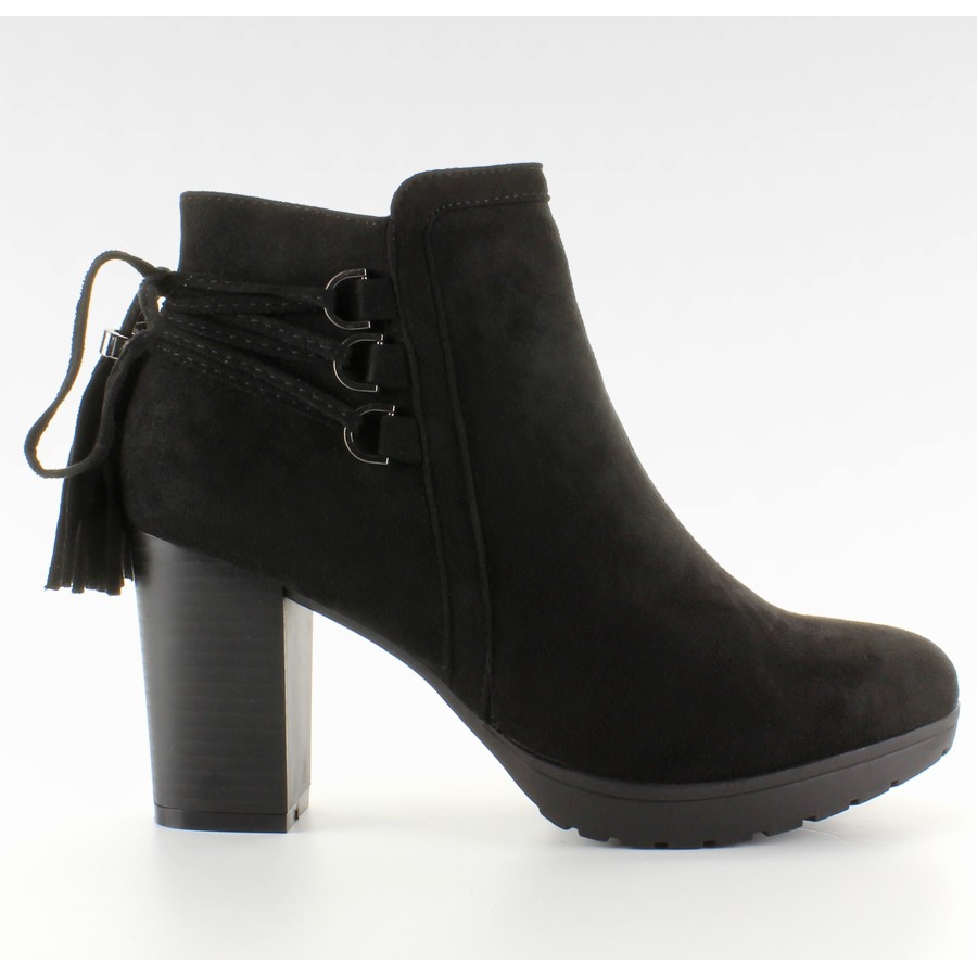 Stylové kotníkové boty vyrobené z ekologického semiše, kombinující pohodlí s módní úpravou. Mají kulatý nos a široký stabilní sloupek s výškou 8,5 cm, který zajišťuje komfort nošení po celý den. Ozdobné šněrování a decentní třásně na zádech dodávají obuvi charakter. Uvnitř je zip pro snadné nazouvání.
