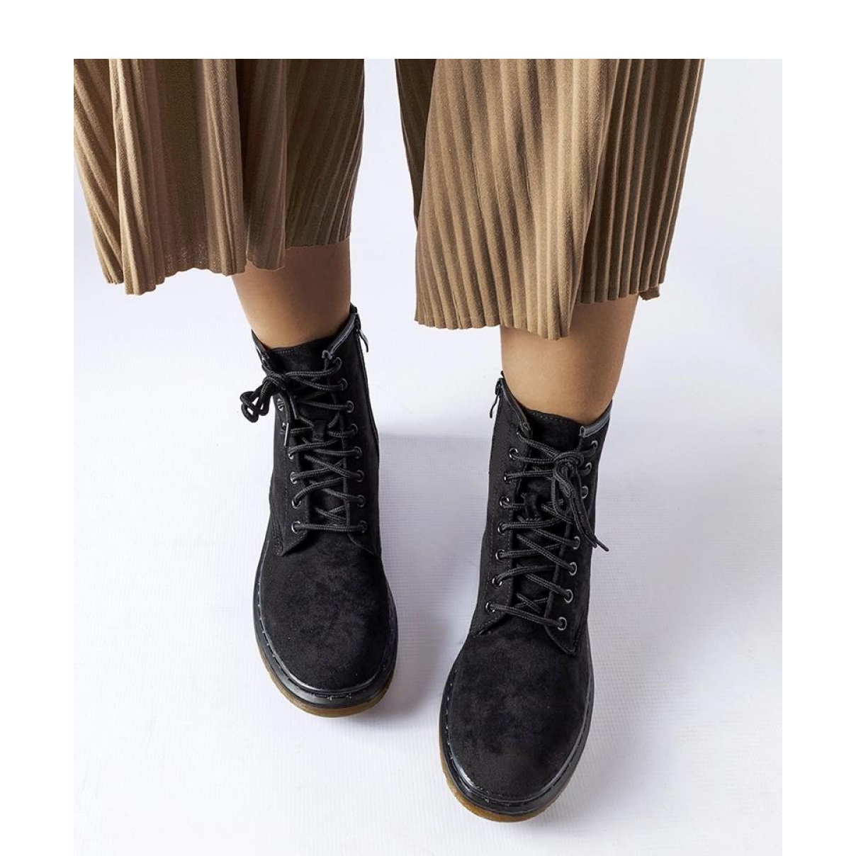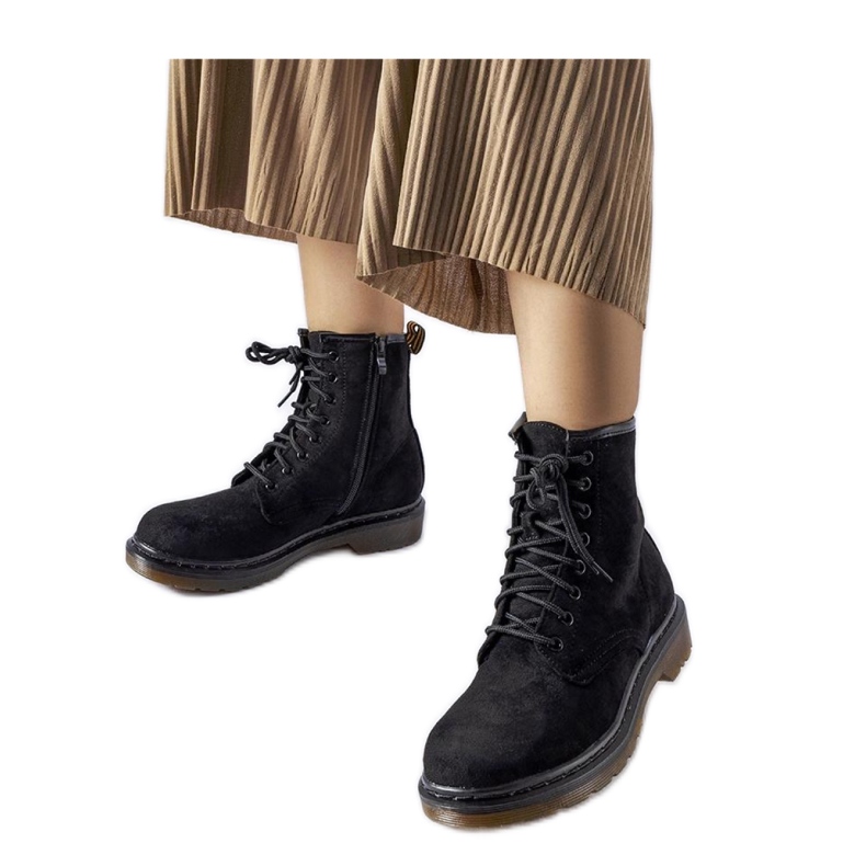 Černí pracovníci Eco-Zamsz jsou jedinečnou obuv, která kombinuje eleganci a pohodlí při každodenním používání. Tyto kotníkové boty jsou vyrobeny z vysoce kvalitní ekologické semišové kůže, charakterizovány nejen estetickým vzhledem, ale také funkčností. Plochý paty s výškou 4 cm přidává ženský přízvuk a gumová podešev poskytuje bezkonkurenční adhezi a stabilitu, což z nich činí skvělou volbou pro procházky v městské džungli a v lesních rozích.