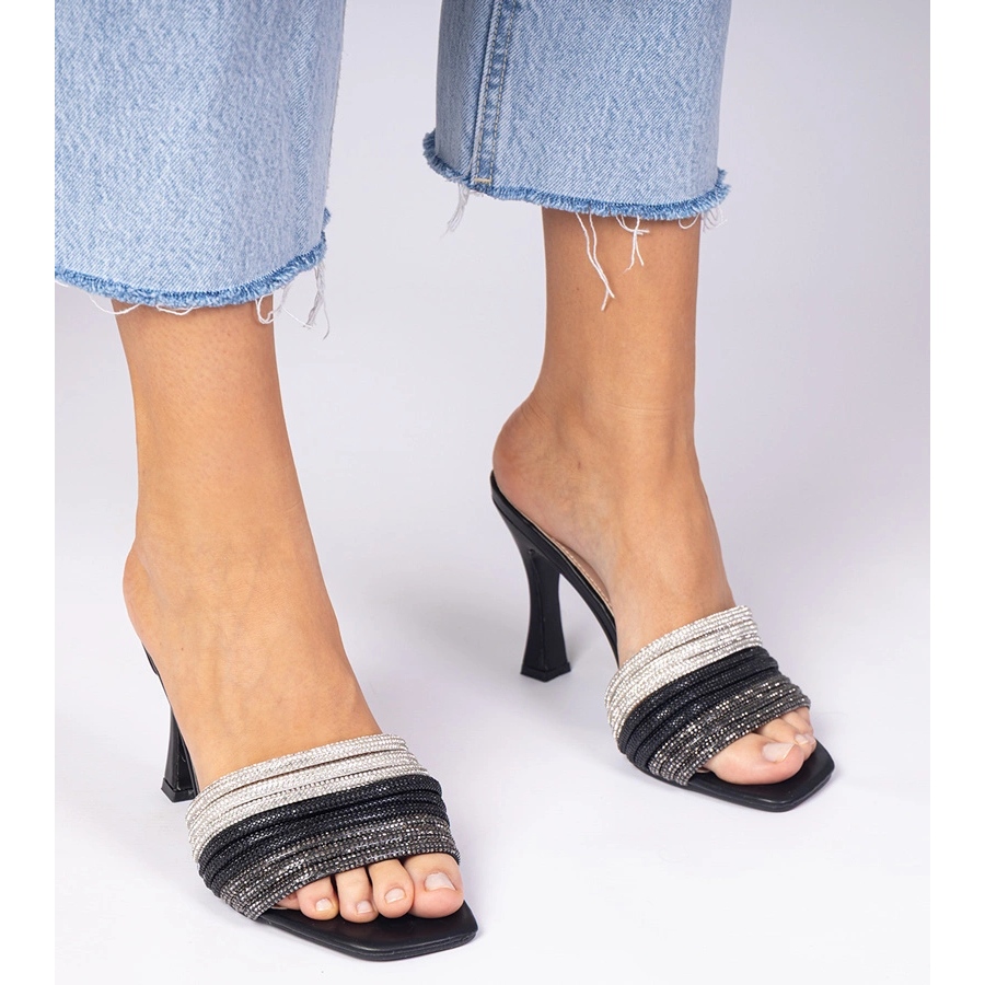 Vysoká pata ve tvaru vysoké paty, 11 cm vysoká, dokonale prodlužuje nohy a přidává důvěru každé ženě, která je nosí. Klasická černá barva zajišťuje všestrannost a snadnost kombinace s různými oděvy, od příležitostných po elegantní. Dekorace ve formě jemných zirkonů zachycují oko, což dává klapkám jedinečný charakter.
