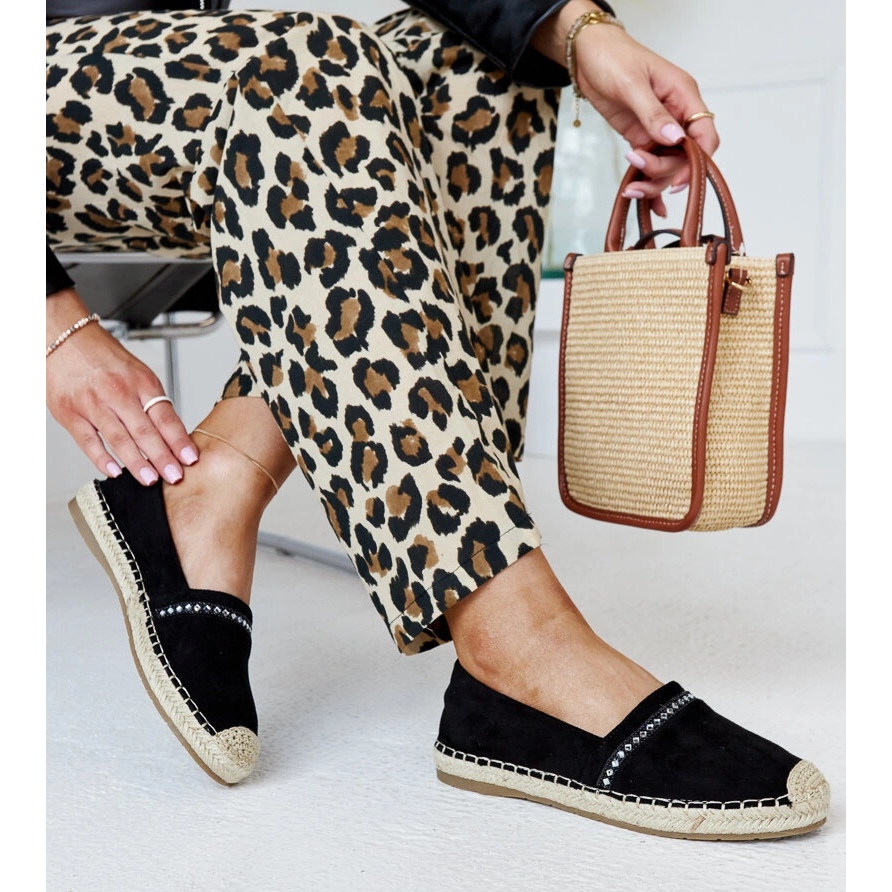 Black Espadrilles s zirkony Abia je skvělou volbou pro letní dny, která potěší každého milence módy. Jejich elegantní kulatý nos a nízký střih, sklizeň, poskytují nejen pohodlí, ale také snadné nasazení. Tyto krásné Espadrilles se vyznačují moderním designem a gumovou podrážkou, díky čemuž jsou ideální pro horké, slunečné dny.