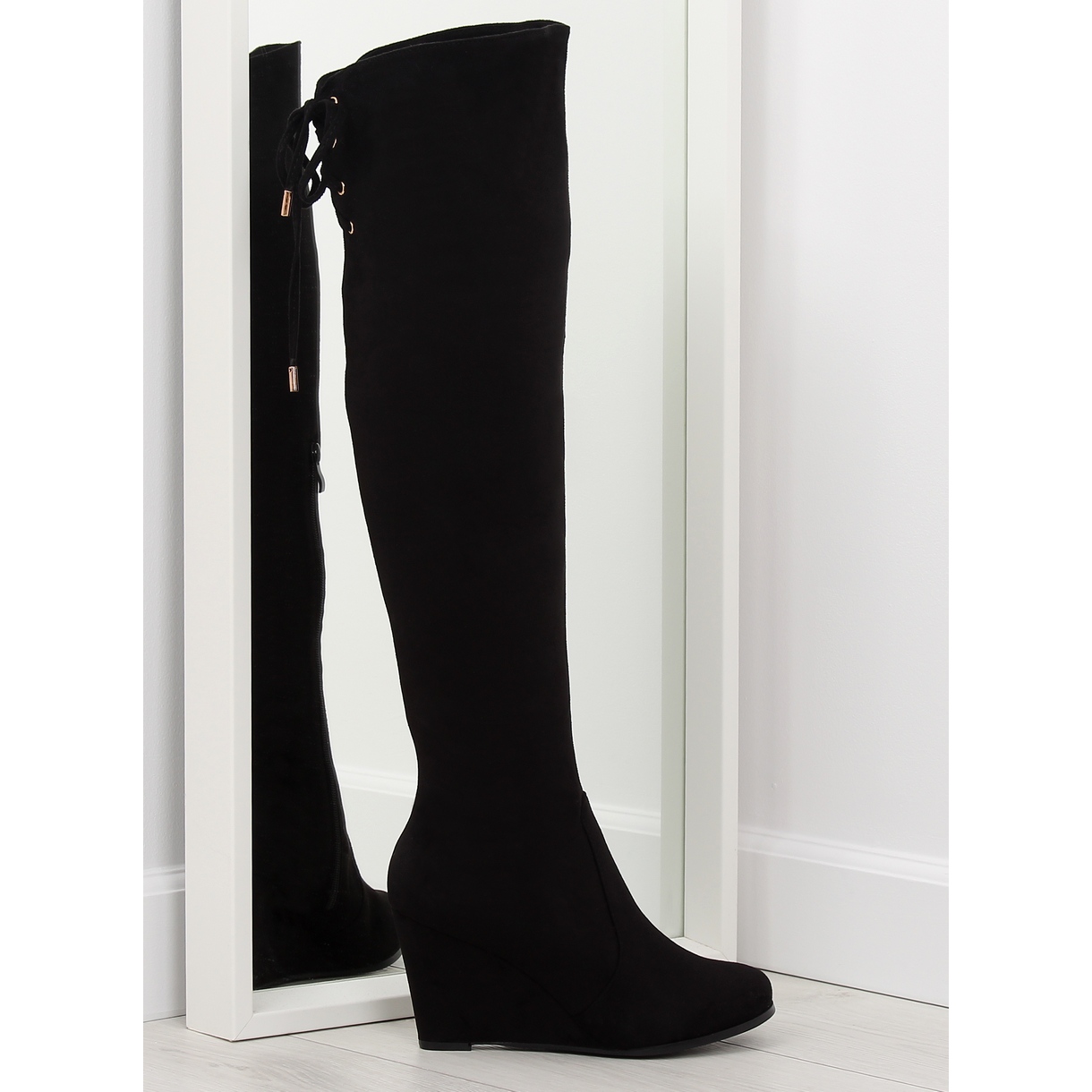 Černé kozačky na klínku LB-263 jsou perfektní volbou pro každou ženu, která chce svému stylu dodat eleganci a originalitu. Tyto klasické kozačky se vyznačují úzkým střihem, který zvýrazní postavu. Výška podpatku 8 cm zajišťuje nejen atraktivní vzhled, ale také komfort nošení. Efektní šněrování vzadu na svršku přitahuje pozornost a dodává botám jedinečný charakter.