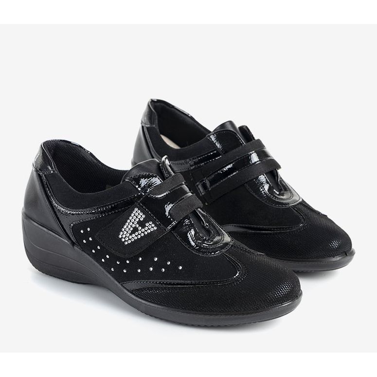Objevte eleganci a pohodlí v černých botách na klínku Merante, ideální pro moderní ženy, které si cení stylu a pohodlí. Tyto boty vyrobené z vysoce kvalitní semišové ekokůže se vyznačují jemným zdobením z lakované ekokůže a kamínků, které jim dodávají jedinečné kouzlo.