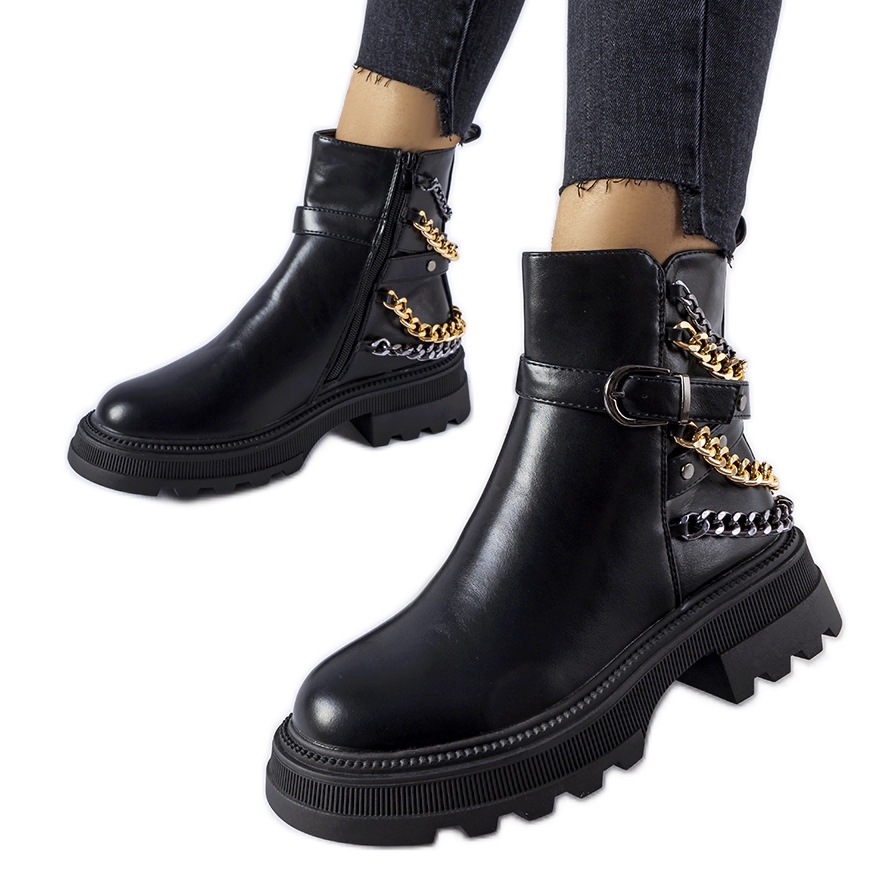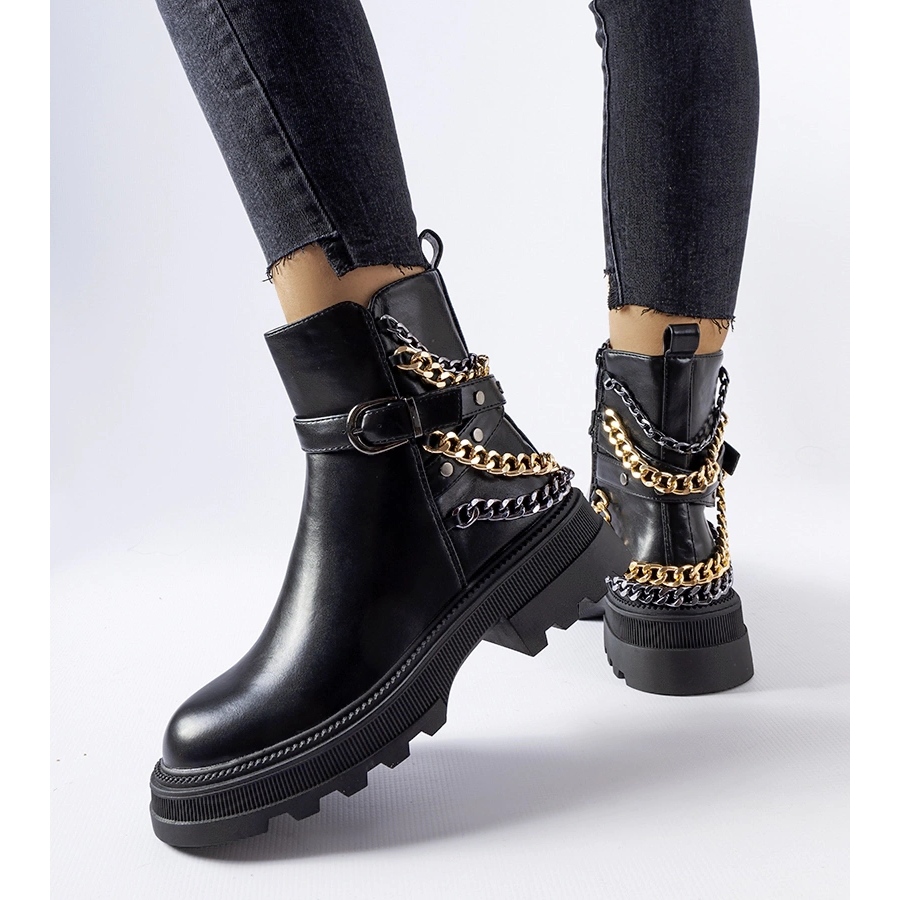 Elegantní a statečný - tyto boty kombinují klasický řez s módním rockovým přízvukem. Černá ekologická kůže s kovovými řetězci ve zlatém a stříbrném odstínu jim dává jedinečný charakter a praktický vedlejší zámek usnadňuje oblékání. Oteplování a gumová podešev zajišťují tepelné pohodlí a stabilní držení na různých površích - ideální pro podzimní - násilnou sezónu.