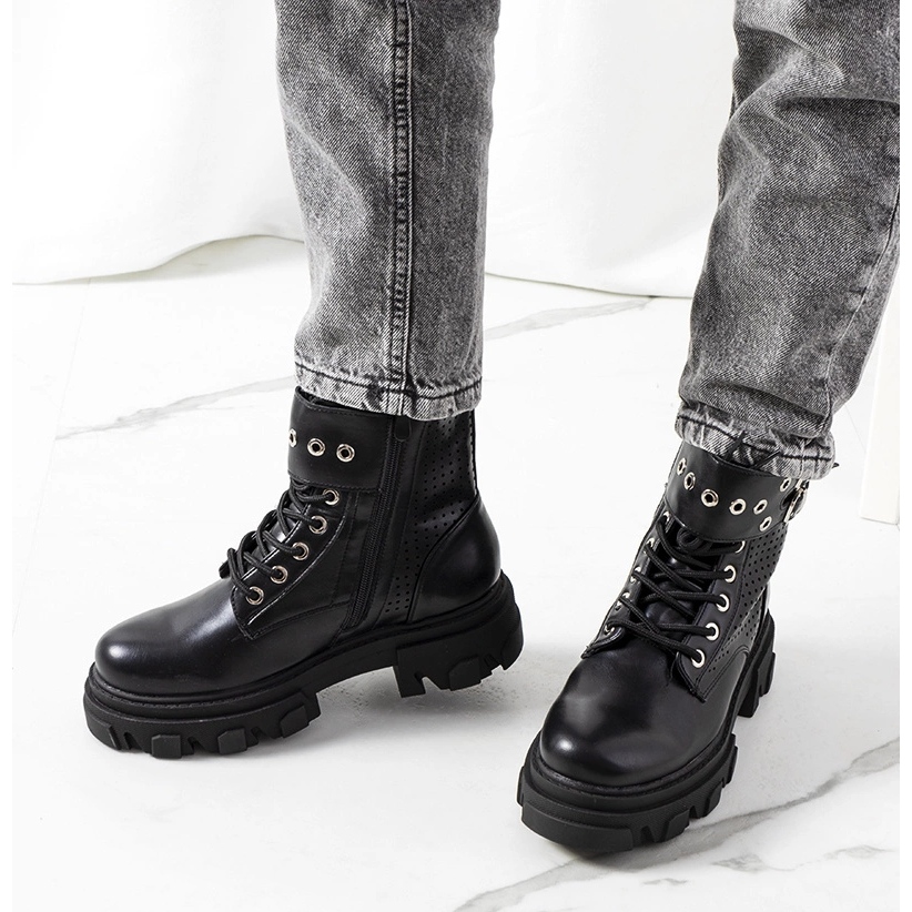 Black Rubeo Boots on a Lopper Suple - perfektní, když chcete přidat styl drápů. Pevná, traktorová podešví jim dává syrovou postavu a otevřené povrchové úpravy a trysky přidávají styl skalního stylu. Horní vyrobená z ekologické kůže ve vysoké kvalitě zajišťuje estetický vzhled a trvanlivost, zatímco vložka ekologické kůže také zaručuje nošení pohodlí.