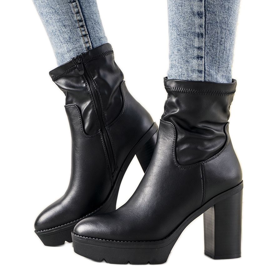 Černé kotníkové boty na vysokém podpatku z elastické kvalitní látky jsou perfektní volbou pro jarní a teplé podzimní dny! Tyto elegantní boty vyrobené z ekologické kůže kombinují styl a pohodlí. Pružný materiál skvěle padne na nohy a vysoký 11 cm podpatek krásně zvýrazní linii nohou a zeštíhlí je.