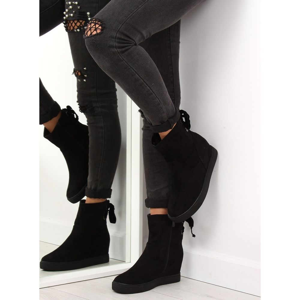 Černé HQ886 Černé kotníkové boty na skrytém klínu jsou nezbytným prvkem šatníku každé ženy, zejména v podzimním období. Tyto elegantní kozačky se vyznačují vysokým svrškem a ozdobným šněrováním, které jim dodává jedinečný charakter. Vyrobeny z ekologického semiše poskytují nejen stylový vzhled, ale díky pěnové podšívce také komfort nošení.