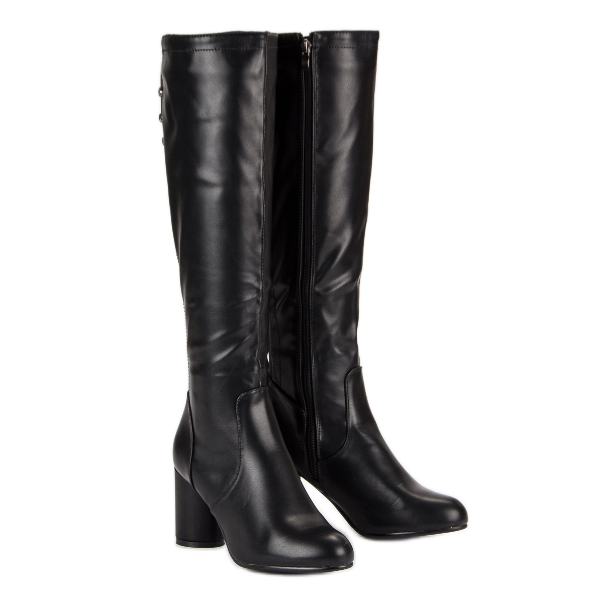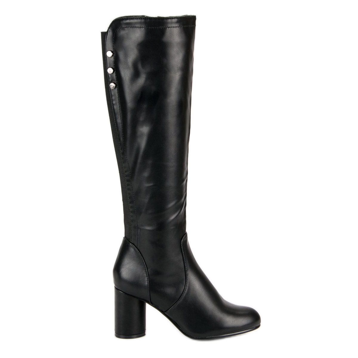 Černé kozačky na podpatku jsou také perfektní volbou do chladnějších dnů, protože jejich klasický design se skvěle hodí k teplým kabátům a svetrům. Ozdobný elastický pásek a jemné kamínky na zadní straně jim dodávají jedinečný charakter, díky čemuž jsou ještě atraktivnější.