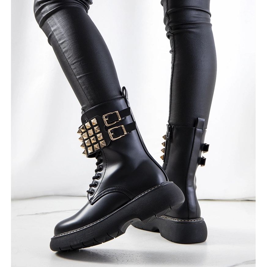 Představujeme černé kozačky s cvočky Lacer od značky PA1, které jistě dodají charakter každému stylingu! Tato módní obuv kombinuje skvělý design s vysokou kvalitou zpracování. Svršek zdobený zlatými cvočky dodává kozačkám úžasný a poutavý vzhled. Vysoká podešev decentně zvýrazňuje nohy a plochý podpatek zajišťuje pohodlí při nošení po celý den.