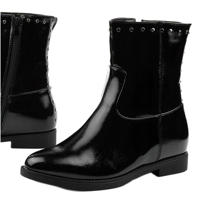 Kozačky vyrobené z vysoce kvalitní ekologické kůže se vyznačují lakovaným svrškem, který jim dodává moderní charakter. Zdobení v podobě pruhu litosu a kamínků činí tyto boty poutavými a perfektní volbou pro ženy, které oceňují módní design.