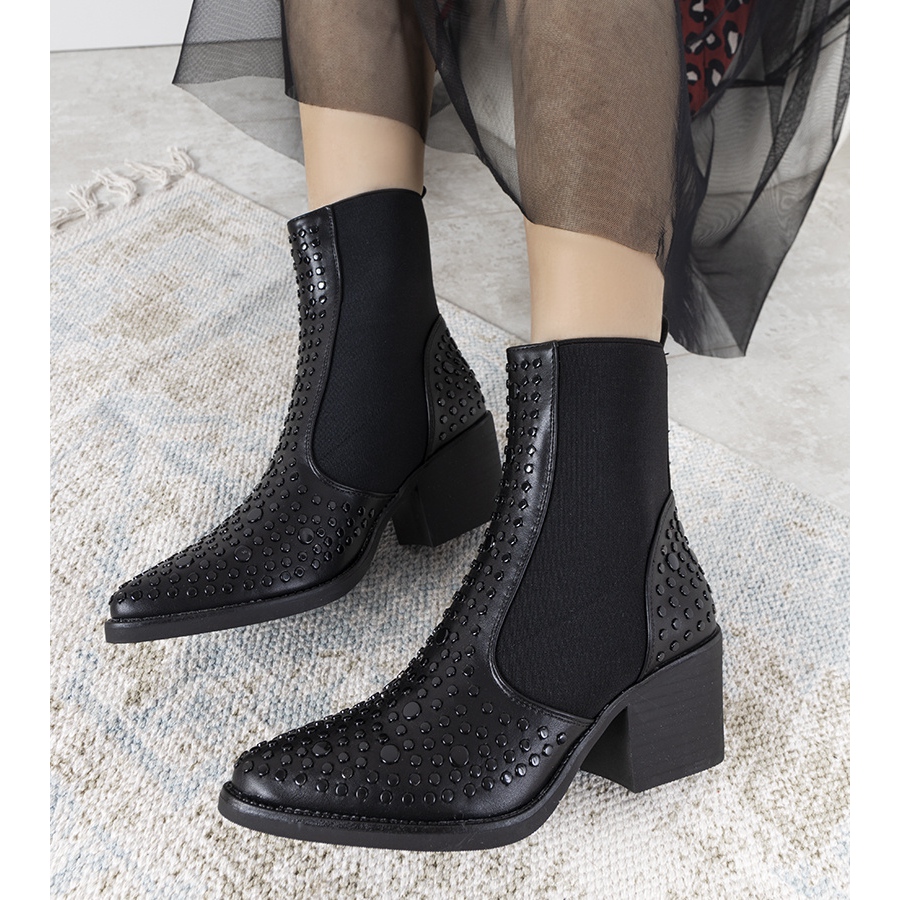 Kotníkové boty Camus se díky ozdobným černým kamínkům odlišují od ostatních modelů, přitahují pozornost a dodávají celému stylingu šmrnc. Špičatá špička a vypasovaný svršek opticky zeštíhlují nohy, což z nich dělá perfektní volbu pro různé příležitosti – od neformálních schůzek až po elegantní výlety.