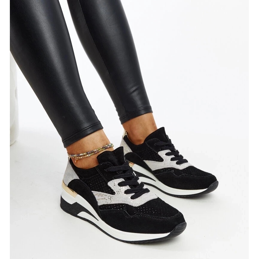 Výška klínu 11,5 cm umožňuje pohodlné zvyšování postavy, aniž by se nevzdala pohodlí sportovní boty. Manfrinové tenisky jsou k dispozici v elegantní černé barvě, která je perfektně s různými stylizacemi.