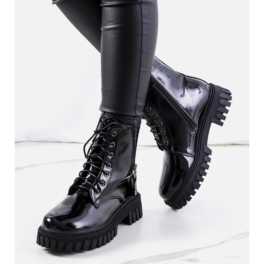 Tyto elegantní kozačky jsou vyrobeny z nejkvalitnější lakované ekologické kůže, která jim dodává nejen atraktivní vzhled, ale také se snadno čistí. Zip na boku boty zajišťuje snadné nazouvání a vyzouvání a přídavné zavazování na přední straně boty umožňuje dokonalé přizpůsobení svršku jednotlivým rozměrům nohy.