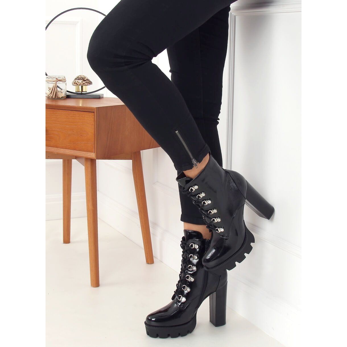 Představujeme jedinečné boty na platformě 0-369 Black, které se stanou neodmyslitelným prvkem vašeho šatníku. Tyto dámské šněrovací kotníkové boty v elegantní lakované černé barvě upoutají pozornost a dodají jedinečný styl.