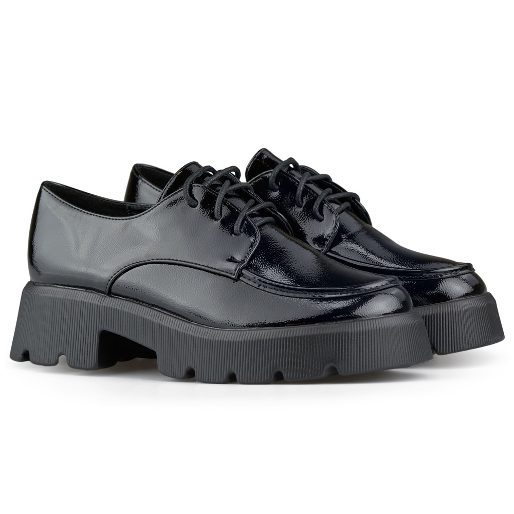 Vložte eleganci a pohodlí s černými lakovanými vázanými ženskými polovinami, ale na silnou podešev od jiné značky. Tyto stylové boty jsou ideální pro různé styly, od příležitostných po formálnější. Vyrobeny z vysoce kvalitní ekologické valené kůže se vyznačují velkolepou záře, která jistě přitahuje vzhled.