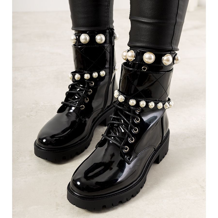 Vysoká trapperová podrážka zdobená ozdobnými pruhy a krásnými perličkami dodává botám charakter a perfektně se hodí k podzimním a zimním stylům. Dodatečné zateplení v podobě krátkého kožíšku zaručuje tepelný komfort i v těch nejchladnějších dnech.