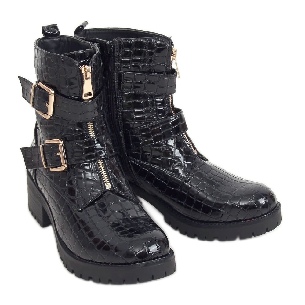 Představujeme dámské černé lakované kozačky SP74-1 Black, které kombinují eleganci s pohodlím a dokonale ladí s nejnovějšími trendy. Tyto jedinečné kozačky na širokém, 5 cm vysokém podpatku upoutají pozornost módním motivem krokodýla a fenomenálními zlatými doplňky, které jim dodávají mimořádný charakter.