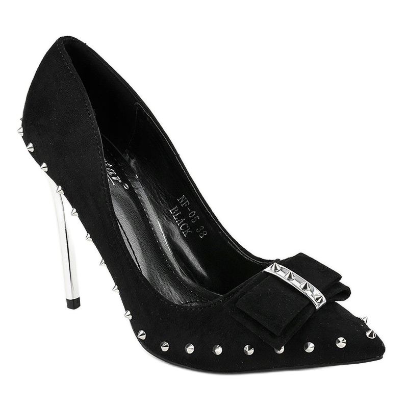 Černé lodičky na vysokém podpatku NF-05 jsou perfektní volbou pro ženy, které oceňují eleganci a styl. Jejich minimalistický design je obohacen o poutavé kovové cvočky a mašličku vpředu, která jim dodává jedinečný charakter. Tyto boty upoutají pozornost nejen díky originálním detailům, ale také díky vysokému, 11centimetrovému jehlovému podpatku, který opticky prodlouží nohy a dodá sebevědomí.