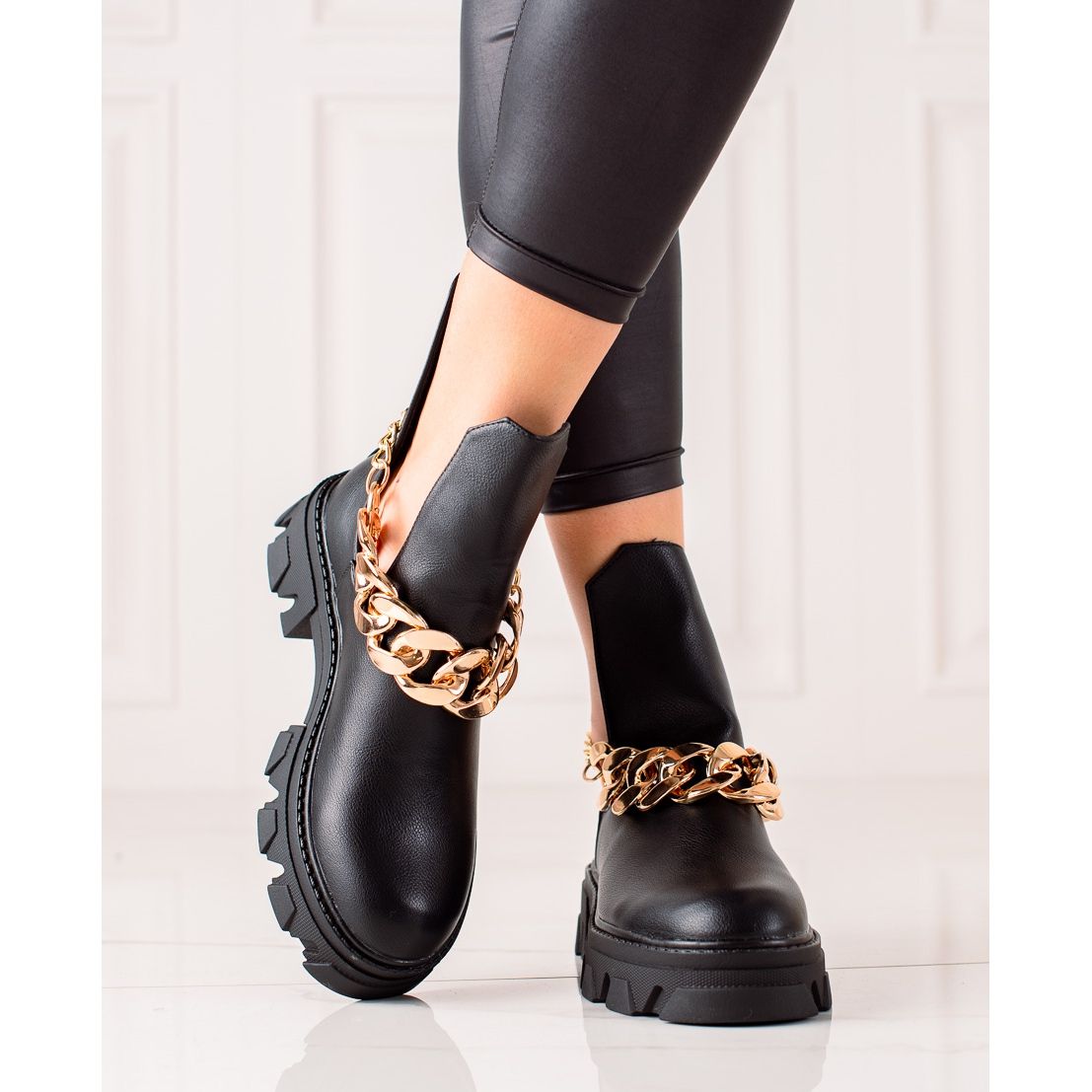 Kozačky vyrobené z vysoce kvalitní imitace kůže se vyznačují zvýšeným měkkým podpatkem a kulatou špičkou, díky čemuž se pohodlně nosí po celý den. Zlatý řetízek umístěný na svršku je dělá atraktivními a dělá z nich nepříliš triviální prvek jakéhokoli stylingu.
