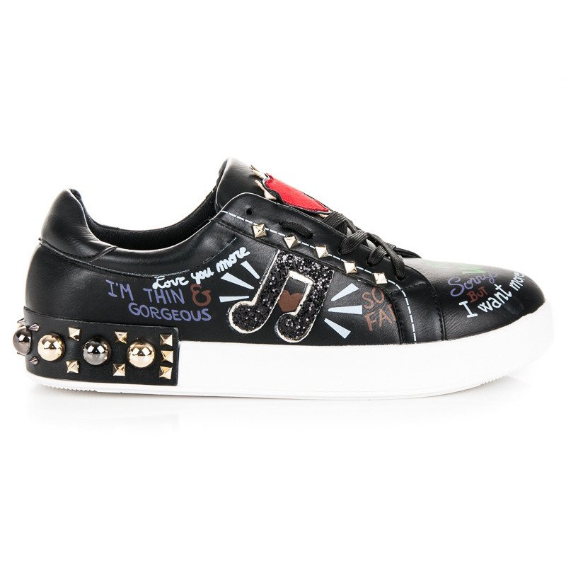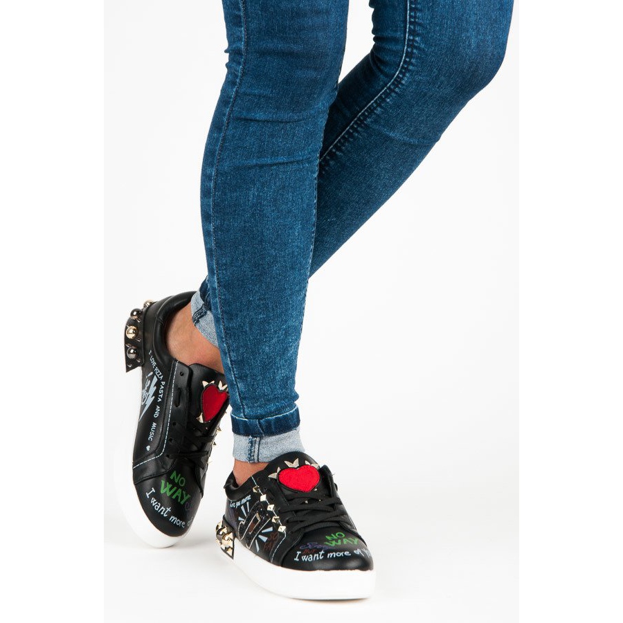 Černé tenisky se vyznačují velmi výrazným designem, který přitahuje pozornost. Četné ozdoby včetně cvočků a jedinečných nápisů jim dodávají rockový charakter a jsou tak ideální volbou pro ženy, které chtějí vyčnívat z davu. Jejich atraktivní vzhled však není všechno - pohodlná látková stélka dělá z nošení těchto bot radost i po mnoho hodin.
