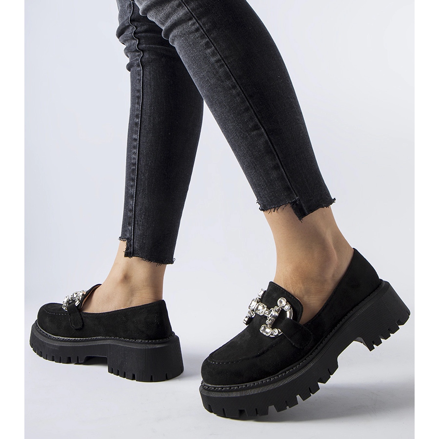 Kamínky umístěné na svršku dodávají těmto mokasínům jemnou jiskru, díky čemuž jsou perfektní volbou pro různé příležitosti – od neformálních schůzek až po formálnější události. Mandlový nos dodává nádech elegance a černá barva se hodí k mnoha stylům a nabízí všestrannost a šarm.