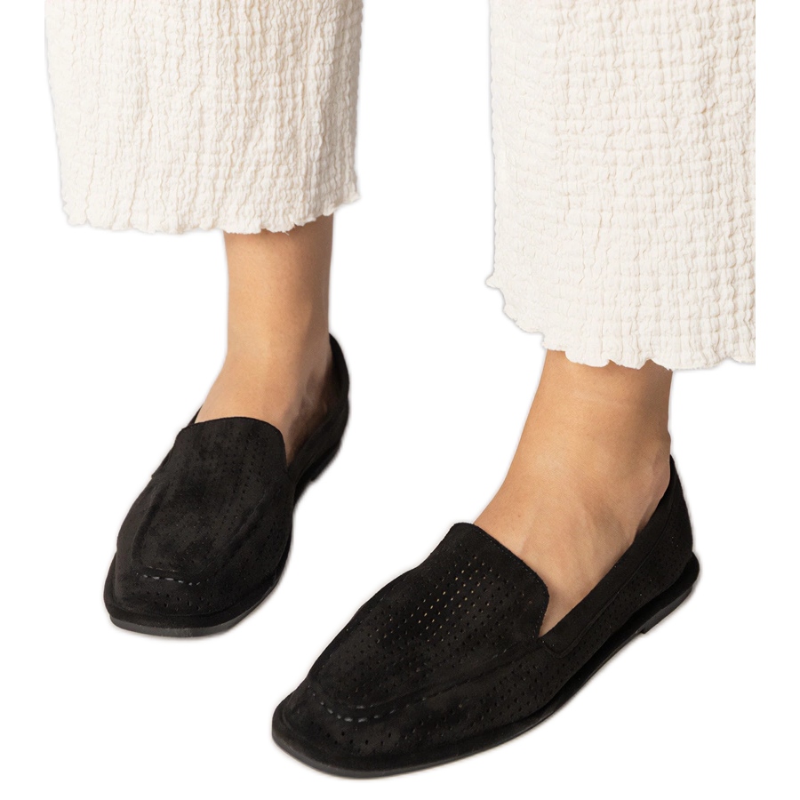 Mokasiny vyrobené z ekologické semišové kůže nejen zajišťují trvanlivost, ale také estetický vzhled. Vzorec otevřených prací jim dává lehkost, což z nich dělá skvělou volbu pro jarní a letní dny. Tyto černé, slichotní mokasíny se dobře prolínají s každodenními i elegantnějšími stylizacemi, což z nich činí všestranný prvek oblečení.