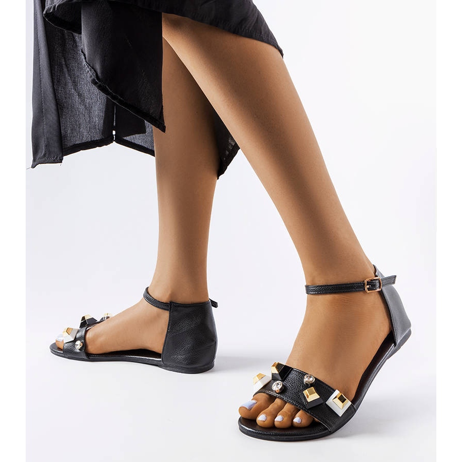 Jejich klasický černý design je zdoben stylovými kamínky a cvočky, které jim dodávají jedinečný charakter. Sandály mají plochý podpatek, díky čemuž se skvěle hodí na každodenní výlety, procházky městem nebo letní večery. Zapínání na přezku zajišťuje snadné přizpůsobení noze a zároveň zajišťuje stabilitu.