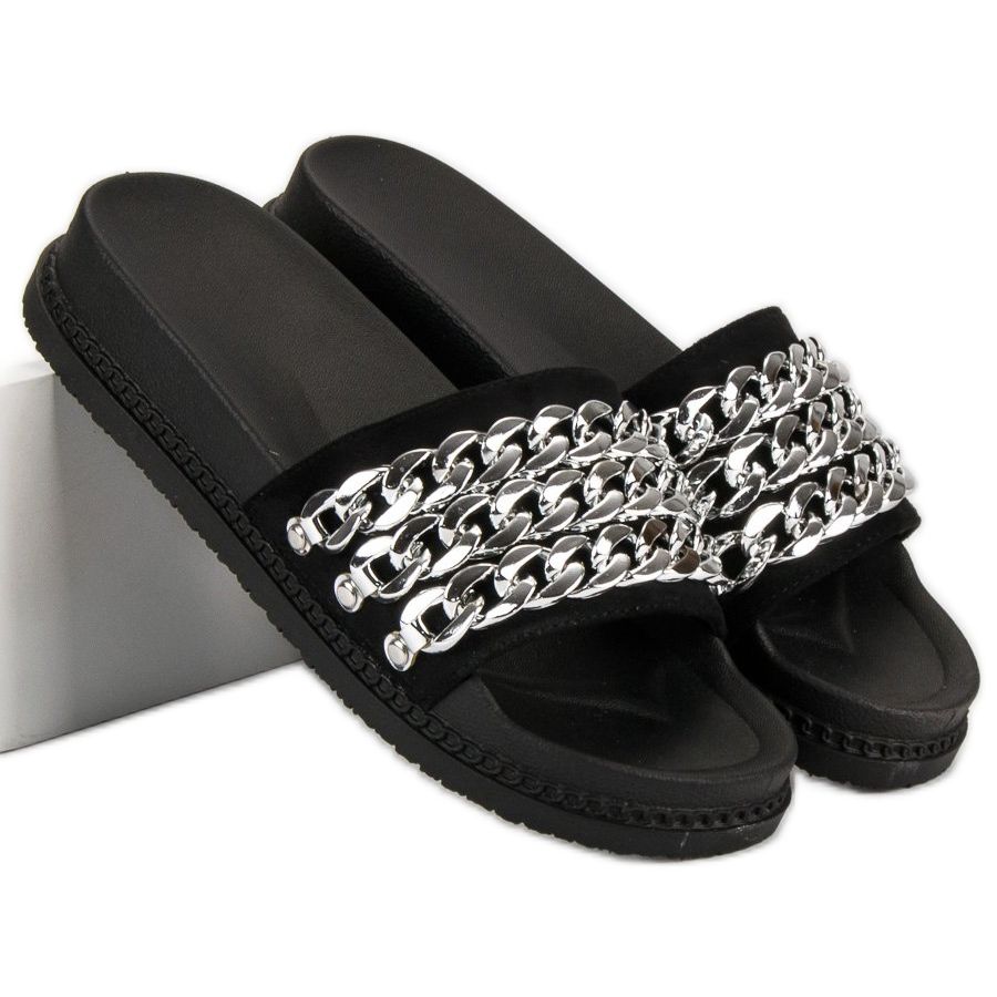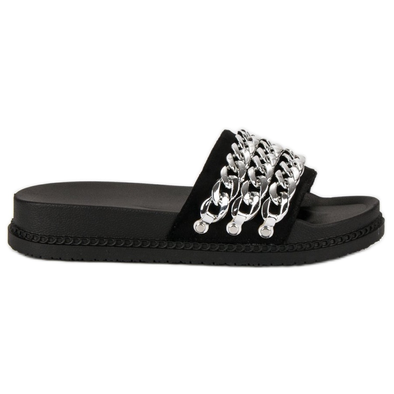 Černá barva žabek hodí k jakémukoli outfitu – od ležérních tepláků až po letní šaty. Chybějící špička umožňuje volné větrání chodidel a výška podpatku 3 cm dodává jemné pohodlí. Žabky nemají žádné vzory, což umožňuje jejich snadné kombinování s ostatními kusy oblečení.