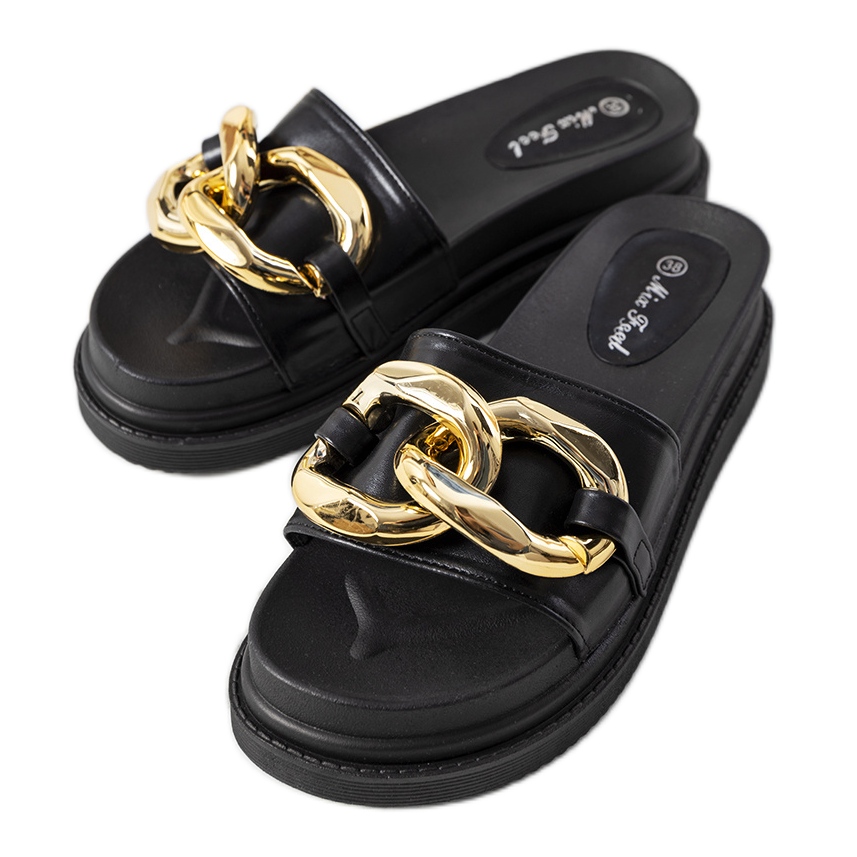 Žabky Berloz vyrobené z vysoce kvalitní ekologické kůže spojují moderní design s funkčností. Kulatý nos a 5 cm vysoká platforma zajišťují pohodlí při nošení a díky klasické černé barvě se hodí ke každému stylu. Další výhodou je jemný řetízek, který jim dodává originální charakter.