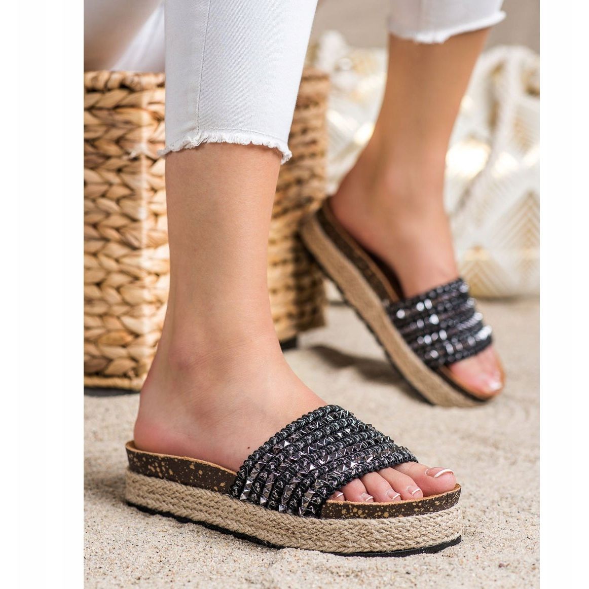 Žabky vyrobené z vysoce kvalitního textilního materiálu vypadají atraktivně díky originálním cvočkům, které jim dodávají jedinečný charakter. Díky univerzální černé barvě se snadno kombinují s různými styly a otevřený podpatek zajišťuje pohodlí při používání.
