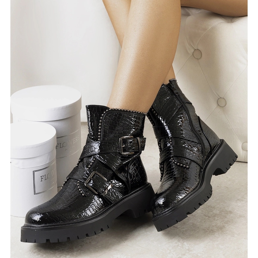 Stylové boty Helia jsou návrhem pro ženy, které rádi kombinují klasiku s expresivními detaily. Horní část je vyrobena z lakované ekologické kůže v lisování s napodobujícím krokodýlem a lesklé doplňky - korálky, kamínky a trysky - dávají botám jedinečný charakter. Interiér je zakončen teplým materiálem napodobujícím kožešinu, díky kterému je model v chladnějších dnech skvělý.
