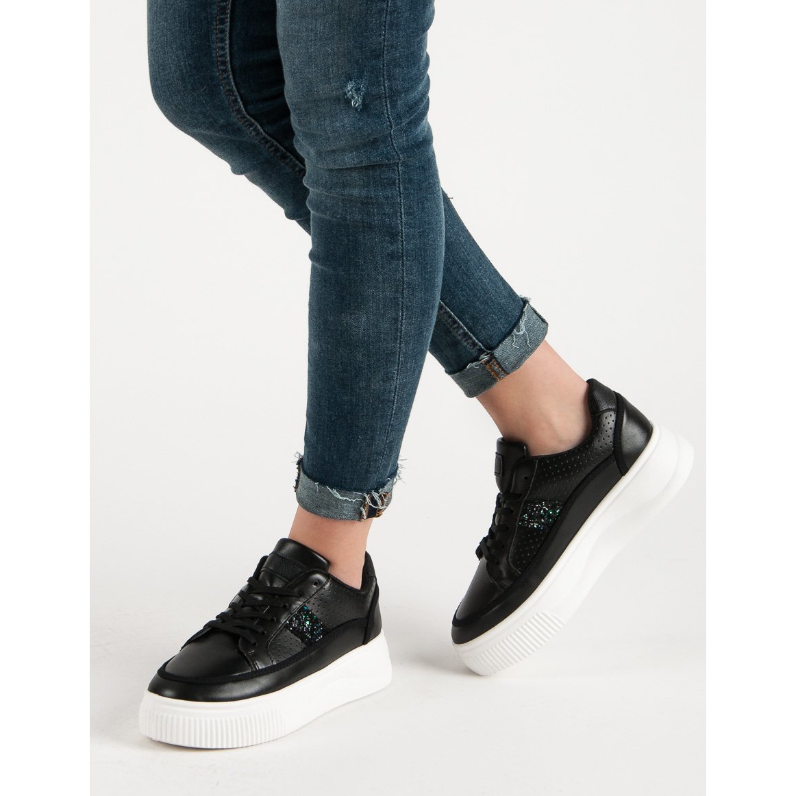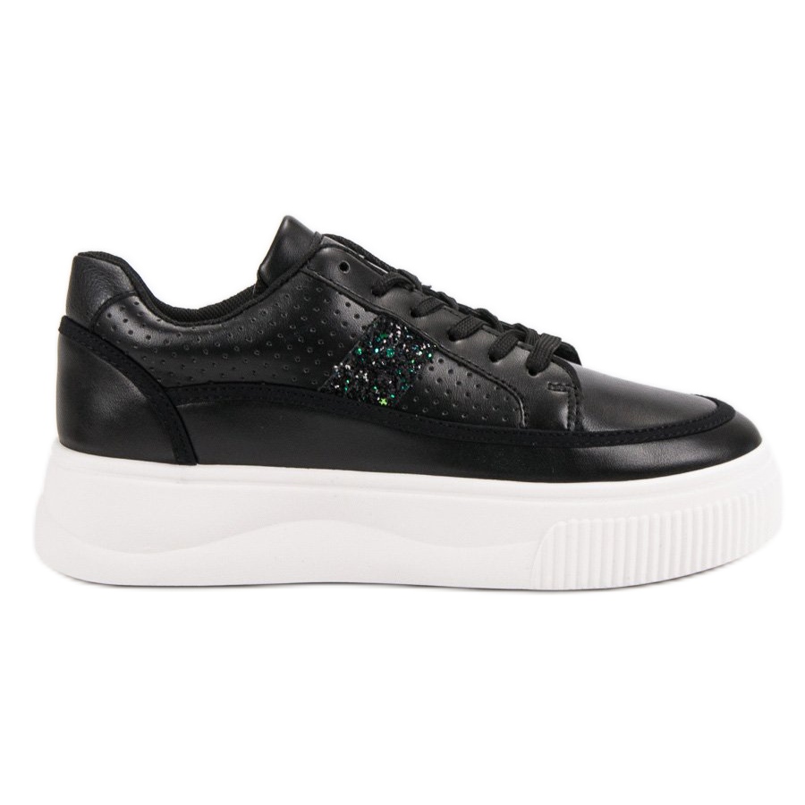 Black Creepers With Glitter jsou perfektní volbou pro ženy, které hledají kombinaci stylu a pohodlí. Tyto módní boty na 4centimetrové platformě nejen opticky zeštíhlí postavu, ale skvěle vypadají i na noze. Díky vestavěné měkké patě a pohodlné syntetické podrážce s nášlapem poskytují skvělou podporu při každodenním používání.