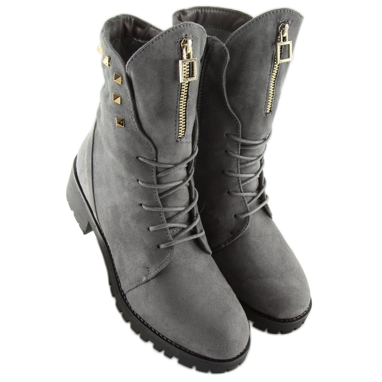 Stylové ženské boty ve skalním klimatu - klasické pracovníci s jemnými dekoracemi. Dekorativní cvočky a efektivní zip na jazyku jim dávají charakter, díky kterému budou dokonale doplňovat méně formální stylizace, což jim dává dráp. Celá krajka -Up, navíc vybavená bočním zámkem, což usnadňuje oblékání. Vyrobeno z ekologického semiše v elegantní černé barvě.