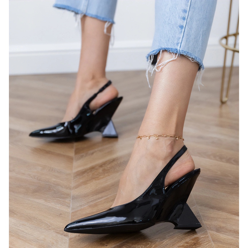 Sandály, vyrobené z lakované ekologické kůže, upoutají oko jejich lesklým vzhledem a módní černou barvou, která se hodí do současných trendů. Výška paty 10 cm jemně zdůrazňuje postavu a přidává eleganci ke každému oblečení.