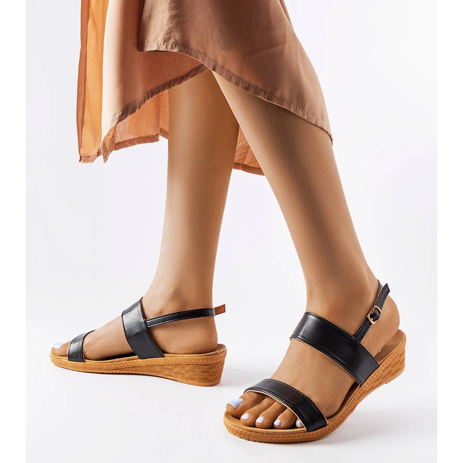 Klasické, pohodlné klínové sandály, ideální pro letní dny. Hladká, elegantní forma v univerzální černé barvě jde dobře s každodenními i elegantnějšími stylizacemi. 4 cm vysoký klín zajišťuje stabilitu a jemně zvedání, aniž by se vzdal pohodlí.