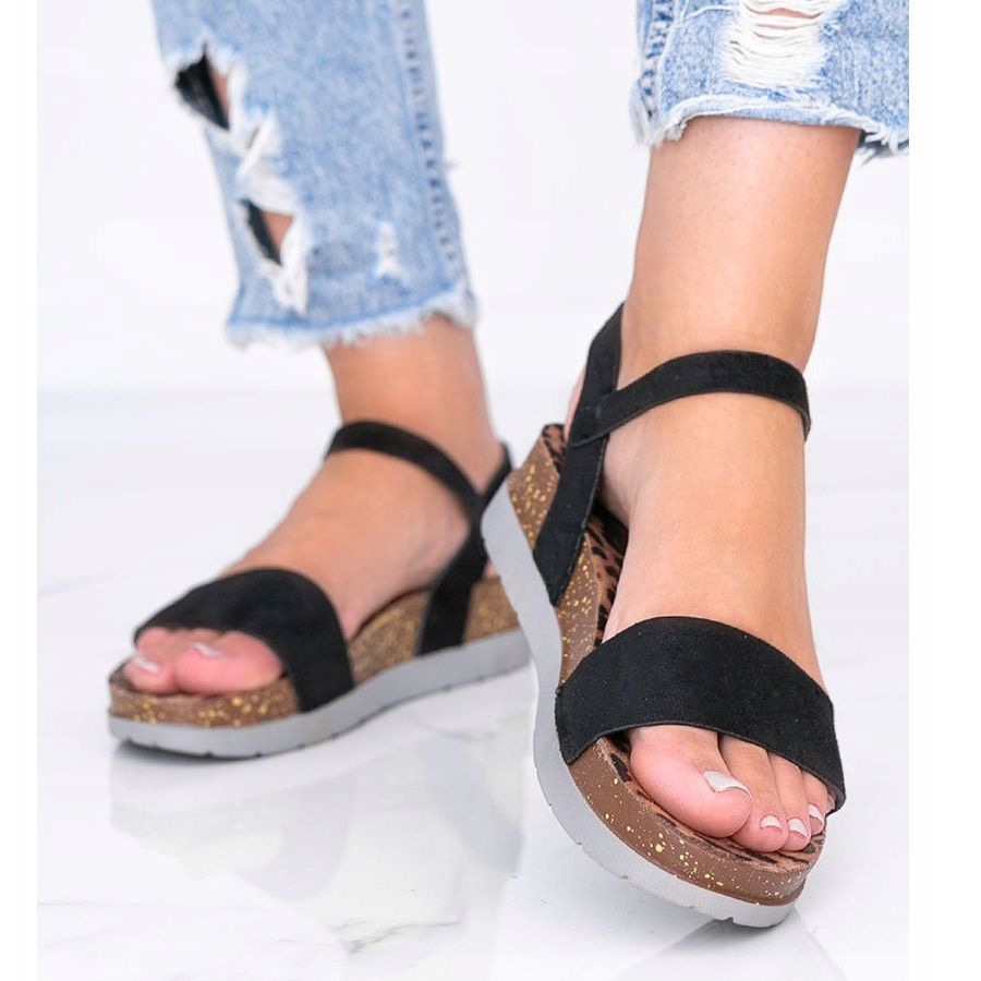 Černé sandály Preatty Pea s vložkou s leopardím potiskem jsou nutností na léto, kombinují styl, pohodlí a jedinečný design. Jsou vyrobeny z ekologické semišové kůže, vypadají elegantně a moderně a jejich výrazná vložka s leopardím potiskem dodává jedinečný střih. Silná, měkká 5 cm vysoká platforma zajišťuje pohodlí při chůzi, díky čemuž se skvěle hodí jak na prázdninové procházky, tak na letní akce ve městě.