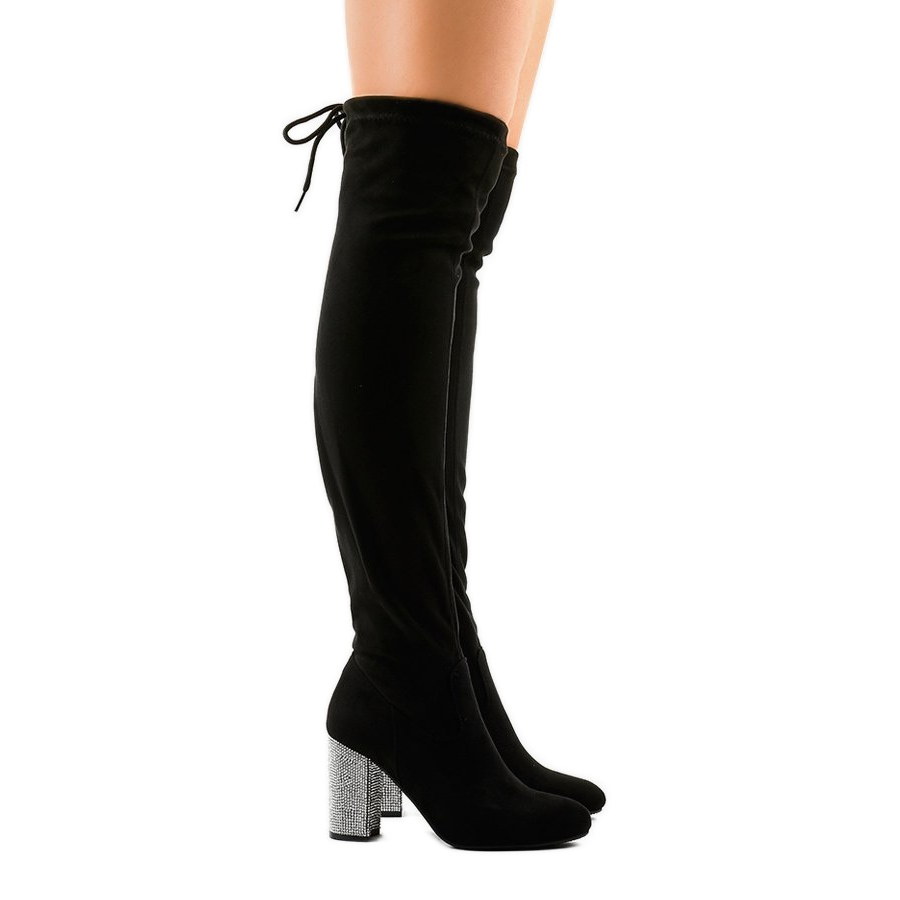 Vysoký svršek, sahající až nad kolena, dodá eleganci každému stylingu a zeštíhlí nohy. Kamínky na patě navíc dodávají trochu lesku a dodávají botám originální charakter.