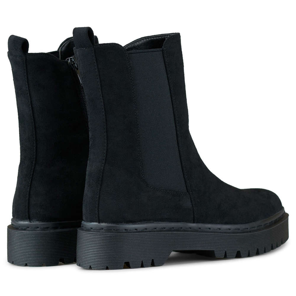 Elegantní, nadčasové boty vyrobené z ekologického semiše v tmavě černé. Stabilní, tlustá podrážka s platformou 4 cm a měkkou izolovanou vložkou (přikrývka na obuvi) zajišťuje teplo a pohodlí během chladnějších dnů a klasický kulatý prst způsobuje, že boty odpovídají příležitostně i mírně elegantnějším stylizacím.