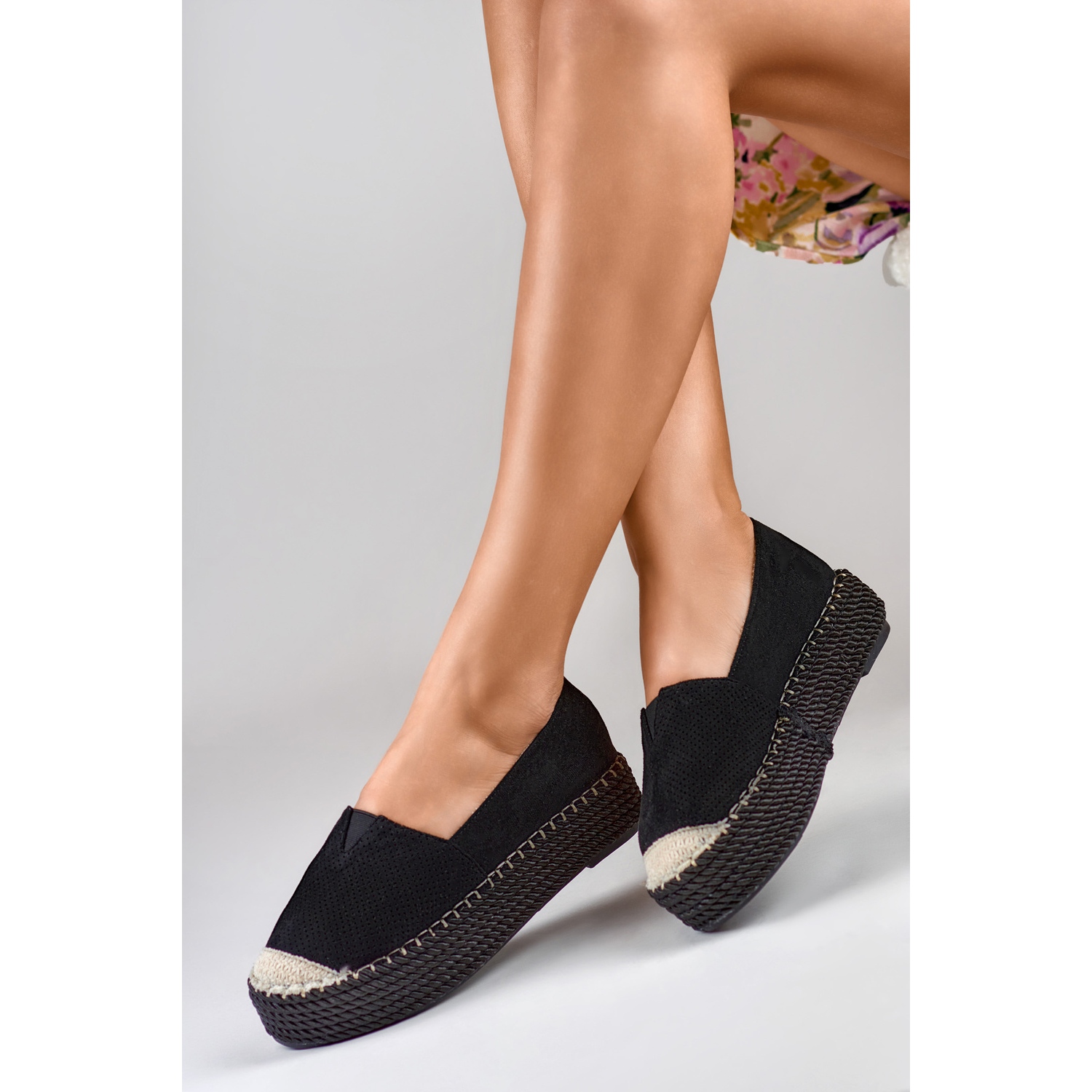 Černé espadrilky se vyznačují kulatou špičkou, která zajišťuje pohodlí při nošení a nazouvací zapínání usnadňuje nazouvání a svlékání. Díky krásnému semišovému svršku vypadají tyto boty mimořádně elegantně a díky minimalistickému designu se hodí k mnoha různým stylům.