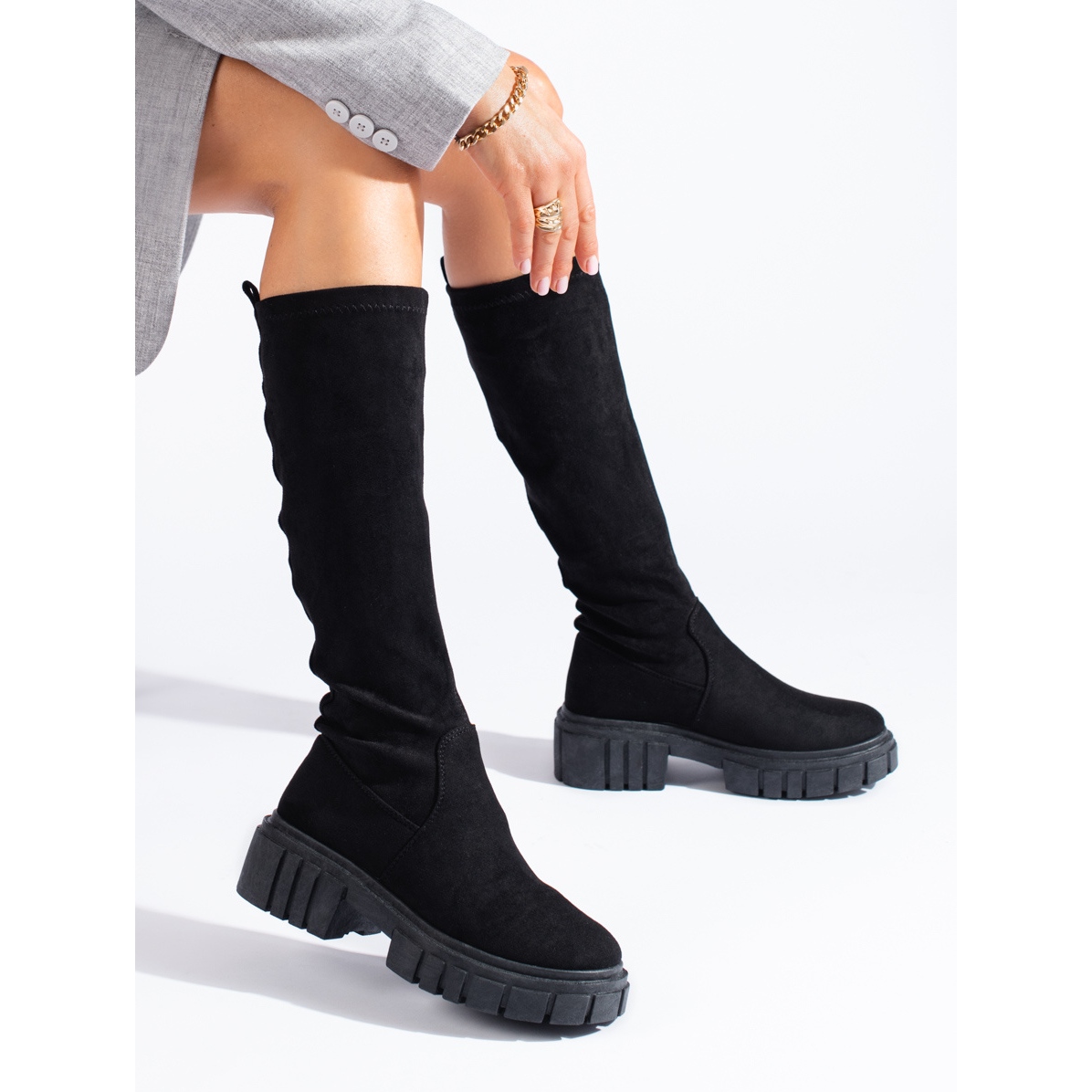 Černé semišové nazouvací boty Shelovet jsou kombinací elegance a ležérního pohodlí, které splní potřeby každé ženy, která si cení klasického stylu a pohodlí. Tyto univerzální kozačky jsou ideální pro podzimní, zimní a jarní dny a jsou skvělou volbou pro různé příležitosti.