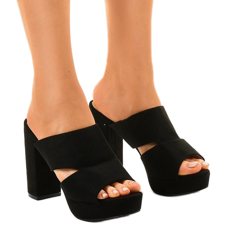 Černé semišové mules na vysokém podpatku 9R55 jsou perfektní volbou pro ženy, které chtějí vyniknout svým stylem. Tyto elegantní, ale ležérní sandály dodají charakter každému outfitu a díky jejich výrazné barvě se hodí prakticky ke všemu.