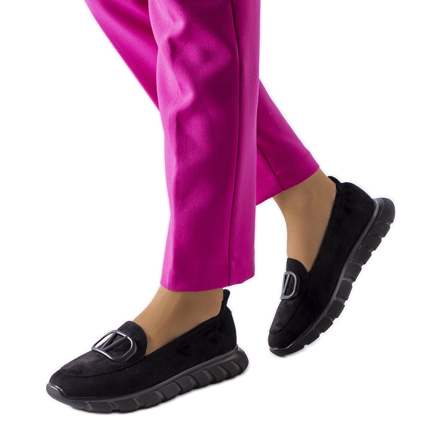 Venezia - Sneakers Black Sneakers Vinceza, které kombinují eleganci s městským stylem. Vyrobeny z semišové ekologické kůže mají kulatý nos a pohodlnou posuvnou sponu - ideální pro rychlé výstupy a denní stylizace. Přední část horního je zdobena plastovou aplikací a jemnými tryskami a model je namontován na zahuštěnou, vyživovanou podrážku, která přidává charakter a stabilitu. Interiér je lemován měkkou vložkou přírodní kůže, která zajišťuje pohodlí i při delším nošení.