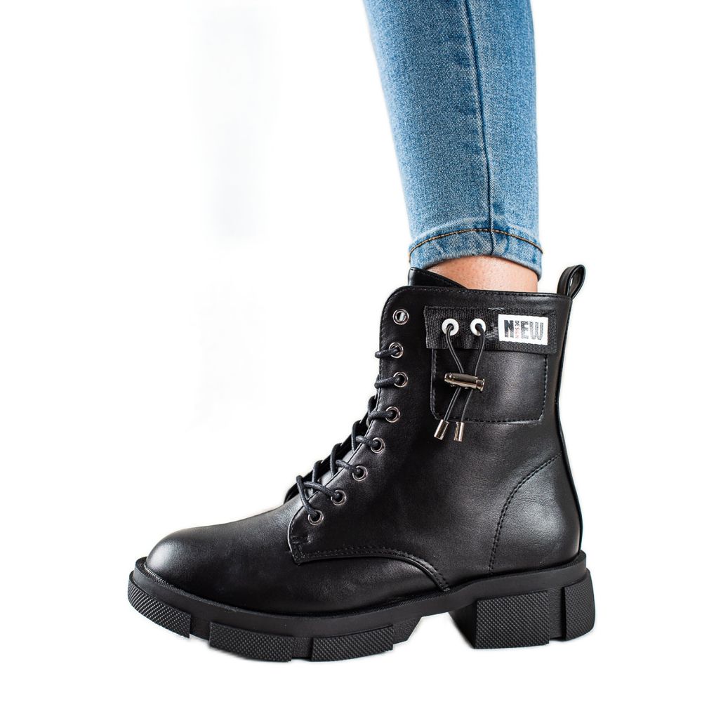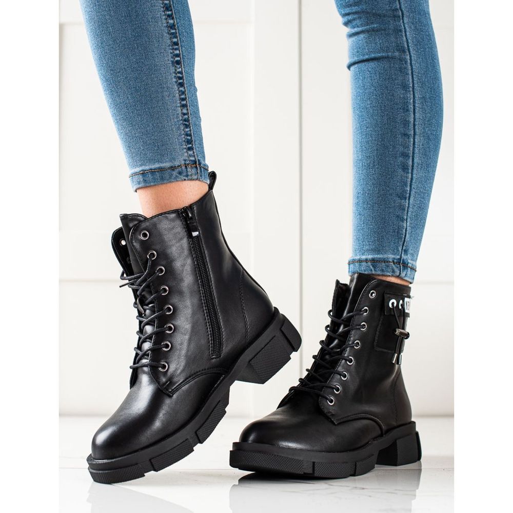 Černé pracovní boty se vyznačují ozdobným pruhem, díky kterému jsou originální a vyčnívají z davu. Kulatá špička a 4 cm plochý podpatek zajistí pohodlí při dlouhých procházkách a zip a šněrování usnadňují nazouvání a přizpůsobení noze.