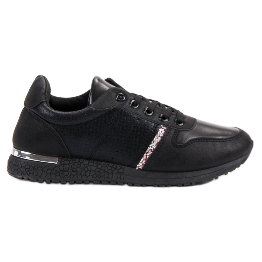 Černé sportovní boty Jumex se zabudovaným měkkým podpatkem a zapínáním na šněrování se přizpůsobí tvaru nohy a zajistí stabilitu a pohodlí při používání. Výška platformy je 3 cm, což navíc zvyšuje komfort nošení, a materiál podrážky je vyroben z plastu s nášlapem zajišťujícím dobrou přilnavost na různých površích.